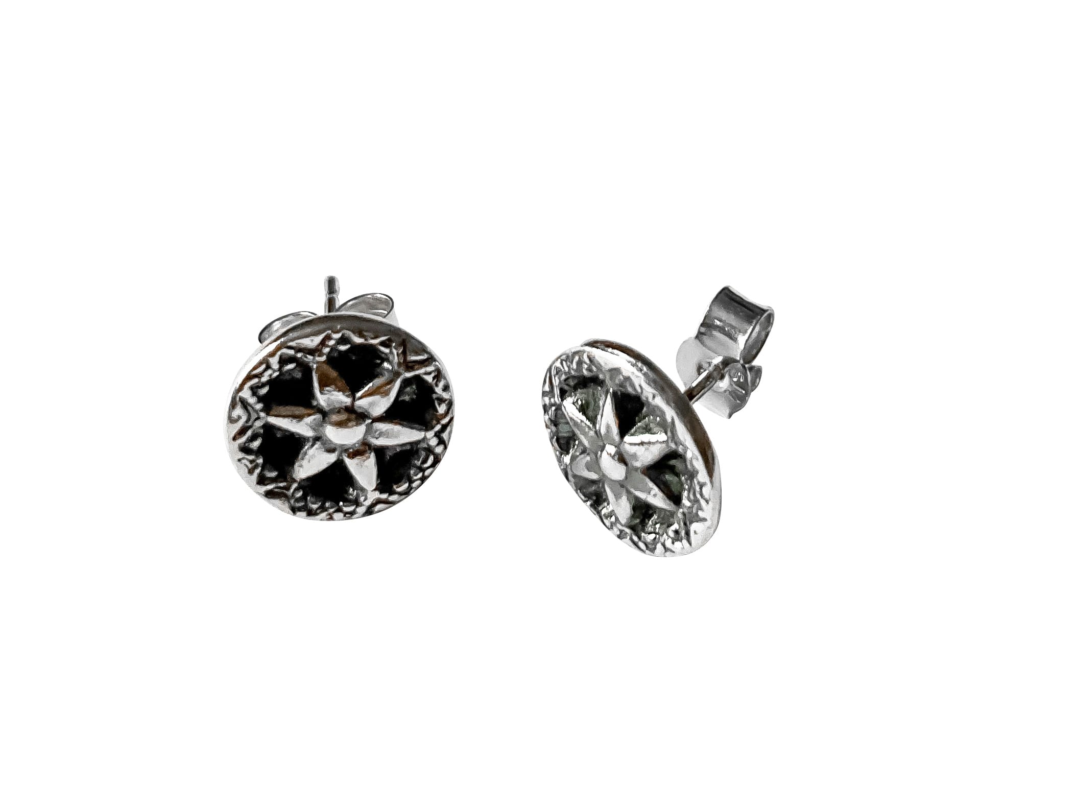 Stud earrings with fine silver small disc tops with a flower pattern and oxidised finish. Diameter of top 1 cm. Sterling silver posts and scrolls.