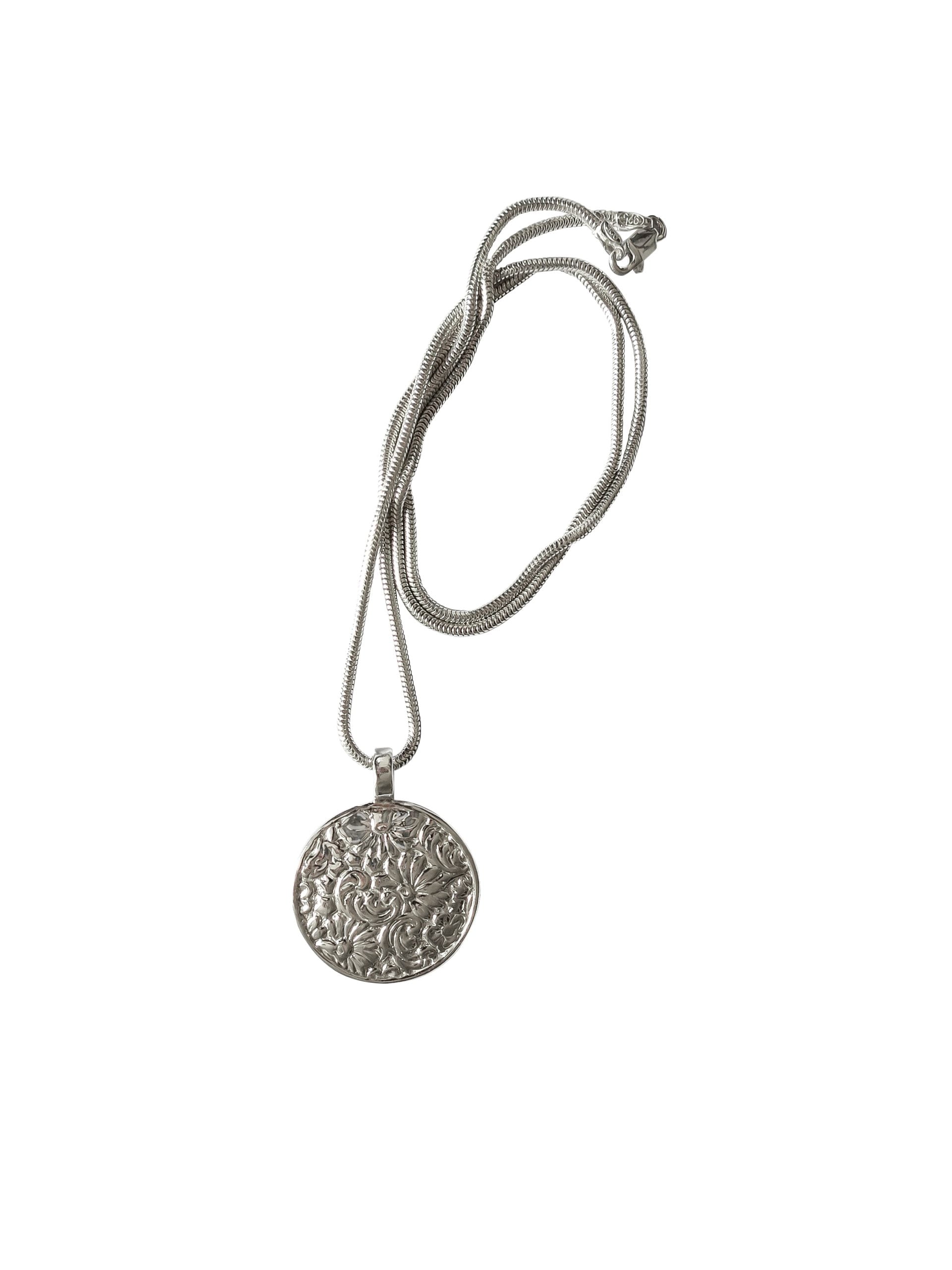 Fine silver pendant with a 3 flowers pattern (diameter 2.5cms) on a sterling silver snake chain. Length 45cm/18″.